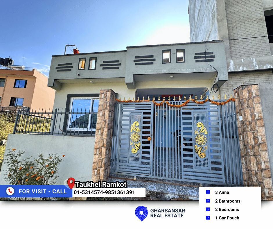 Nestled in the peaceful area of Taukhel, Ramkot, just 2.5 km from Sitapaila Ring Road, this one-storey residential home is now available for sale. Sitting on a spacious 3-anna plot, this property offers a cozy and practical living space, ideal for small families or individuals seeking comfort and convenience.