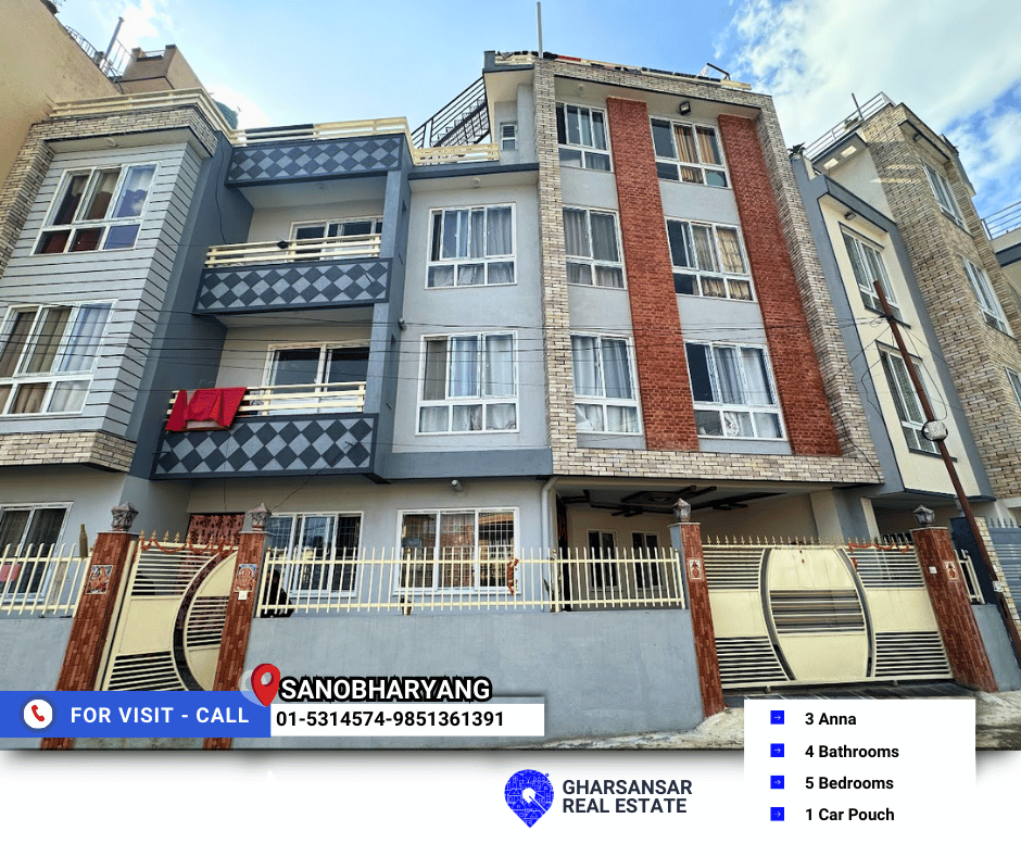 A prime investment opportunity awaits in Sanobharyang, near Ring Road with this 3.5-storey residential building, now available for sale. Set on 3 anna 3 paisa of land, this property provides generous space, ideal for large families or those seeking rental income potential.