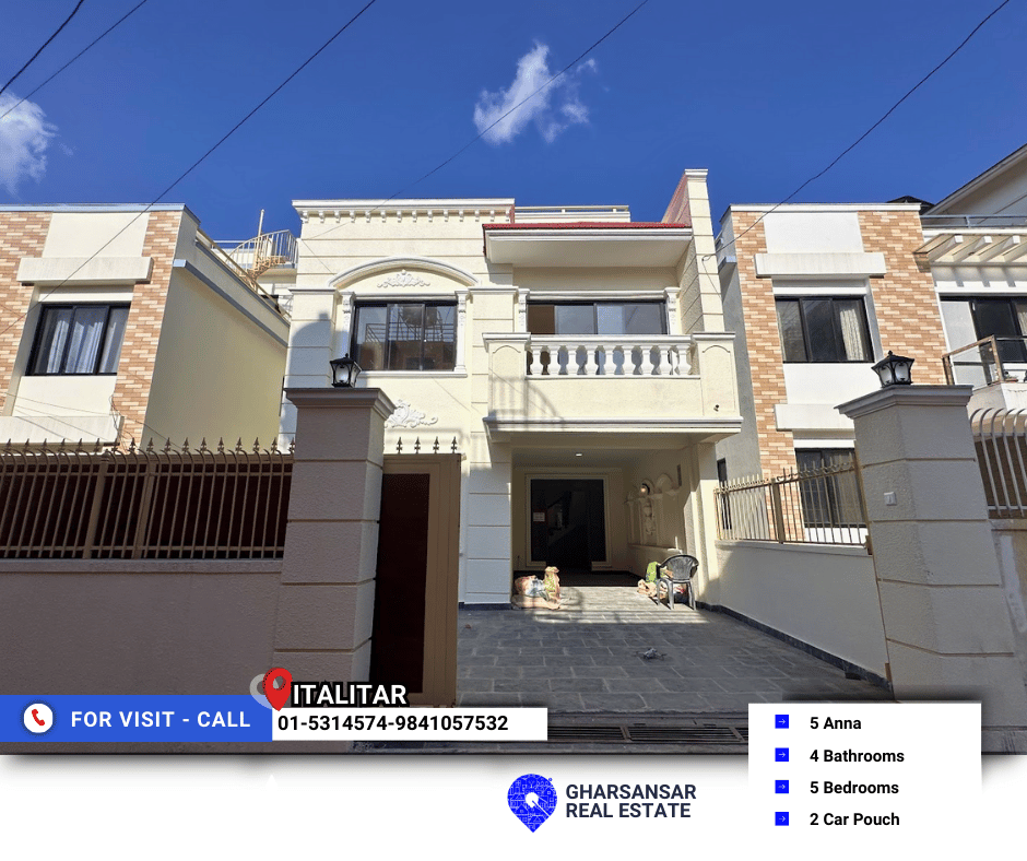 Discover this elegant 2.5-storey residence situated just 100 meters from the vibrant Budhanilkantha Italitar main road. Set on a generous 5 anna plot, this stunning white house offers a perfect balance of comfort and convenience in one of Budhanilkantha's most desirable locations. The property boasts a thoughtful design that maximizes natural light, featuring modern interiors that exude warmth and sophistication.