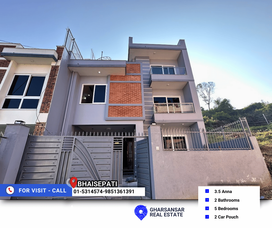A 2.5-storey house concept home is now available for sale in Bhaisepati, Gokul Awas. this brand-new house offers modern construction, and a perfect blend of comfort, style, and rental opportunity. Built on 3.5 Anna of land, the house spans 2485 sq. ft., making it ideal for families seeking a peaceful neighborhood with quality amenities.
