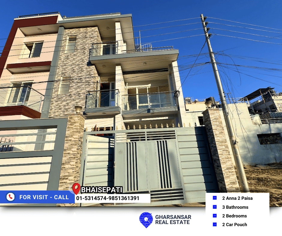 A 2.5-storey house concept home is now available for sale in Bhaisepati, Medicity Hospital. this brand-new house offers modern construction, and a perfect blend of comfort and style. Built on 2 Anna 2 Paisa of land, the house spans 1,510 sq. ft., making it ideal for families seeking a peaceful neighborhood with quality amenities.