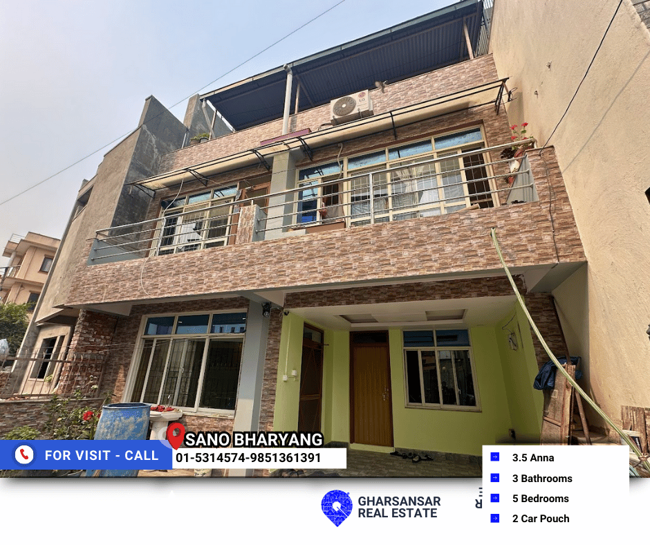 A 2.5-storey house concept home is now available for sale in Sano Bharyang. this house offers modern construction, and a perfect blend of comfort, style, and rental opportunity. Built on 3.5 Anna of land, the house spans 2,600 sq. ft., making it ideal for families seeking a peaceful neighborhood with quality amenities.