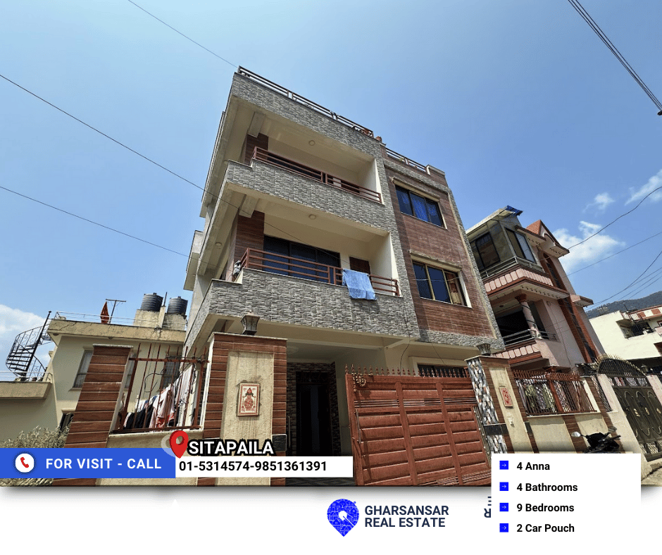 A 3.5-storey house concept home is now available for sale in Sitapaila, Adeshwor. this house offers modern construction, and a perfect blend of comfort, style, and rental opportunity. Built on 4 Anna of land, the house spans 2,800 sq. ft., making it ideal for families seeking a peaceful neighborhood with quality amenities.