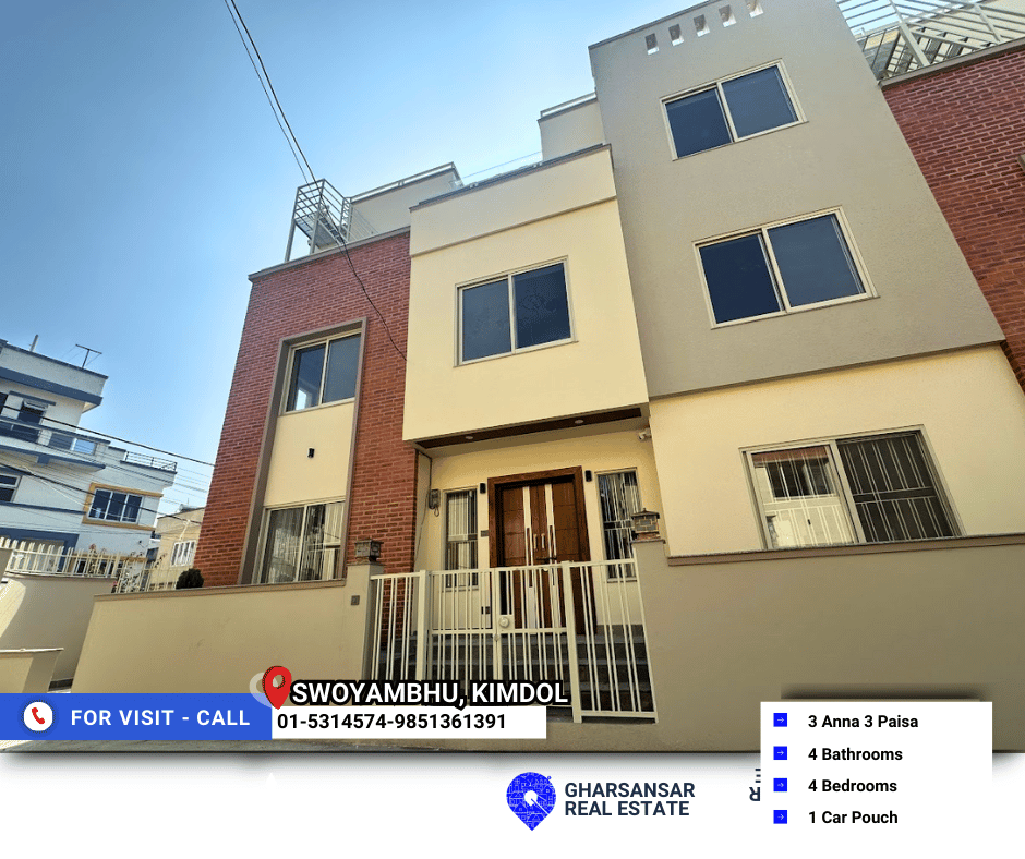 A 2.5-storey house concept home is now available for sale in Swoyambhu, Kimdol. this house offers modern construction, and a perfect blend of comfort, style, and rental opportunity. Built on 3 Anna 3 Paisa of land, the house spans 2,600 sq. ft., making it ideal for families seeking a peaceful neighborhood with quality amenities.
