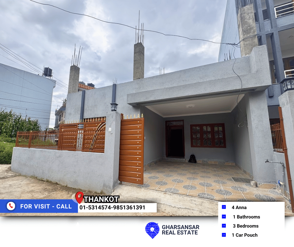 Nestled in the peaceful area of Thankot, Old CheckPost, just 100 meter from Bigmart Ring Road, this 1.5-storey residential home is now available for sale. Sitting on a spacious 4-anna plot, this property offers a cozy and practical living space, ideal for small families or individuals seeking comfort and convenience.