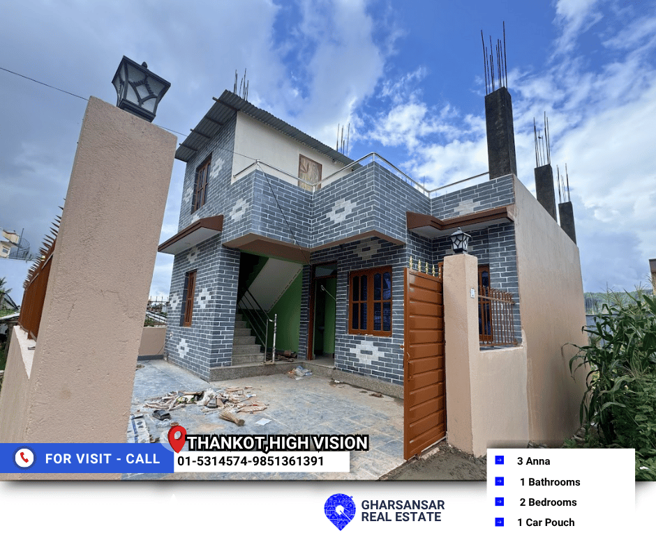 Nestled in the peaceful area of Thankot, High Vision, just 400 meter from Thankot Checkpost Ring Road, this 1.5-storey residential home is now available for sale. Sitting on a spacious 3-anna plot, this property offers a cozy and practical living space, ideal for small families or individuals seeking comfort and convenience.