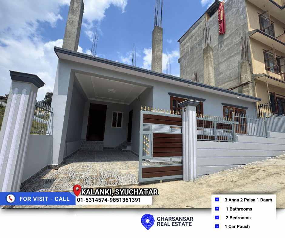 Nestled in the peaceful area of Kalanki, Syuchatar, just 1.5 km from Kalanki Dental Clinic Ring Road, this 1-storey residential home is now available for sale. Sitting on a spacious 3-anna 2 Paisa 1 Daam plot, this property offers a cozy and practical living space, ideal for small families or individuals seeking comfort and convenience.