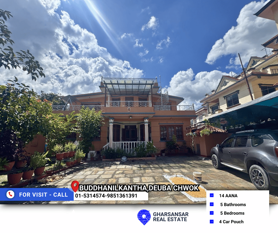 Located in the serene residential hub of Budhanilkantha, Deuba Chowk, with Binayak Housing as a prime landmark, this beautiful home offers an excellent combination of comfort, modern design, and premium space. Spread across a generous 14 aana of land, the property has been thoughtfully built with strong 12x12 inch RCC pillars, ensuring durability and quality construction.