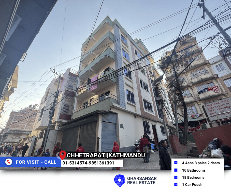 This is an exceptional opportunity to own a highly versatile property located in the sought-after area of Chettrapati, Kathmandu, offering both strong commercial potential and comfortable residential living. Positioned just 50 meters from the Ring Road, this property enjoys outstanding connectivity, ensuring high visibility and easy access for business operations.