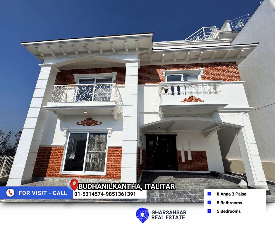 A beautifully designed modern bungalow is available for sale in the peaceful and highly desirable Italitar area of Budhanilkantha, located just 100 meters from the main Ring Road, ensuring excellent connectivity while maintaining a calm residential environment.