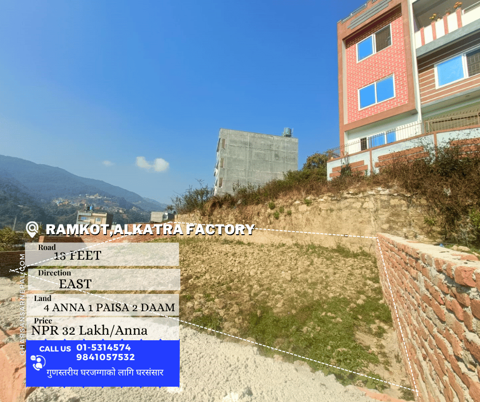 Discover a prime land opportunity in Ramkot, with proximity to Alkatra Factory and Wilson Academy. Priced at an attractive 32 lakhs per anna, this property boasts an east-facing orientation, a 13-feet gravel road, and a spacious land size of 4 anna 1 paisa 2 daam. Situated just 2 kita away from an 8-meter wide road off the main highway, this plot offers both accessibility and potential. The essentials you need are conveniently located nearby, and the gated community enhances security and exclusivity. Don't miss out on this ideal investment opportunity in a sought-after location.
