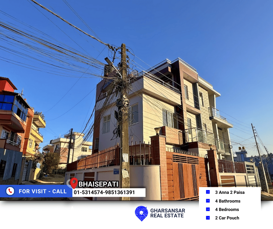 A 2.5-storey house concept home is now available for sale in Bhaisepati, Medicity Hospital. this brand-new house offers modern construction, and a perfect blend of comfort and style. Built on 3 Anna 2 Paisa of land, the house spans 1,600 sq. ft., making it ideal for families seeking a peaceful neighborhood with quality amenities.