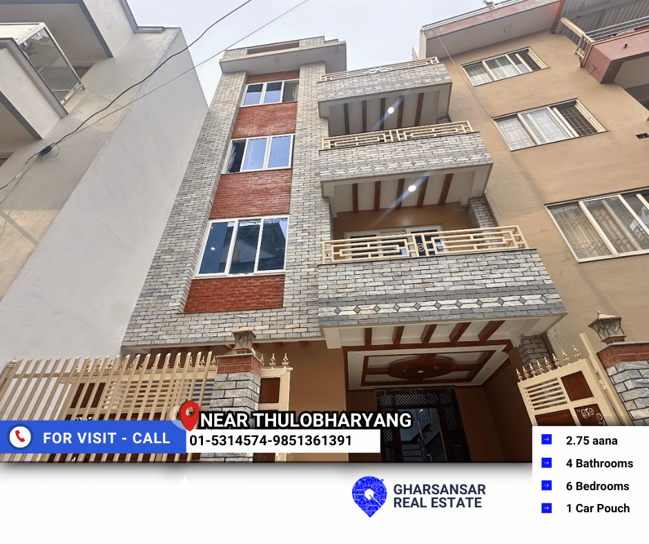 A rare opportunity to own a spacious and well-designed residential house in the prime location of Thulobharyang, situated just 300 meters from Ring Road. Built on 2.75 Aana land, this south-facing property offers excellent sunlight, accessibility, and a practical multi-floor layout ideal for family living or rental potential.