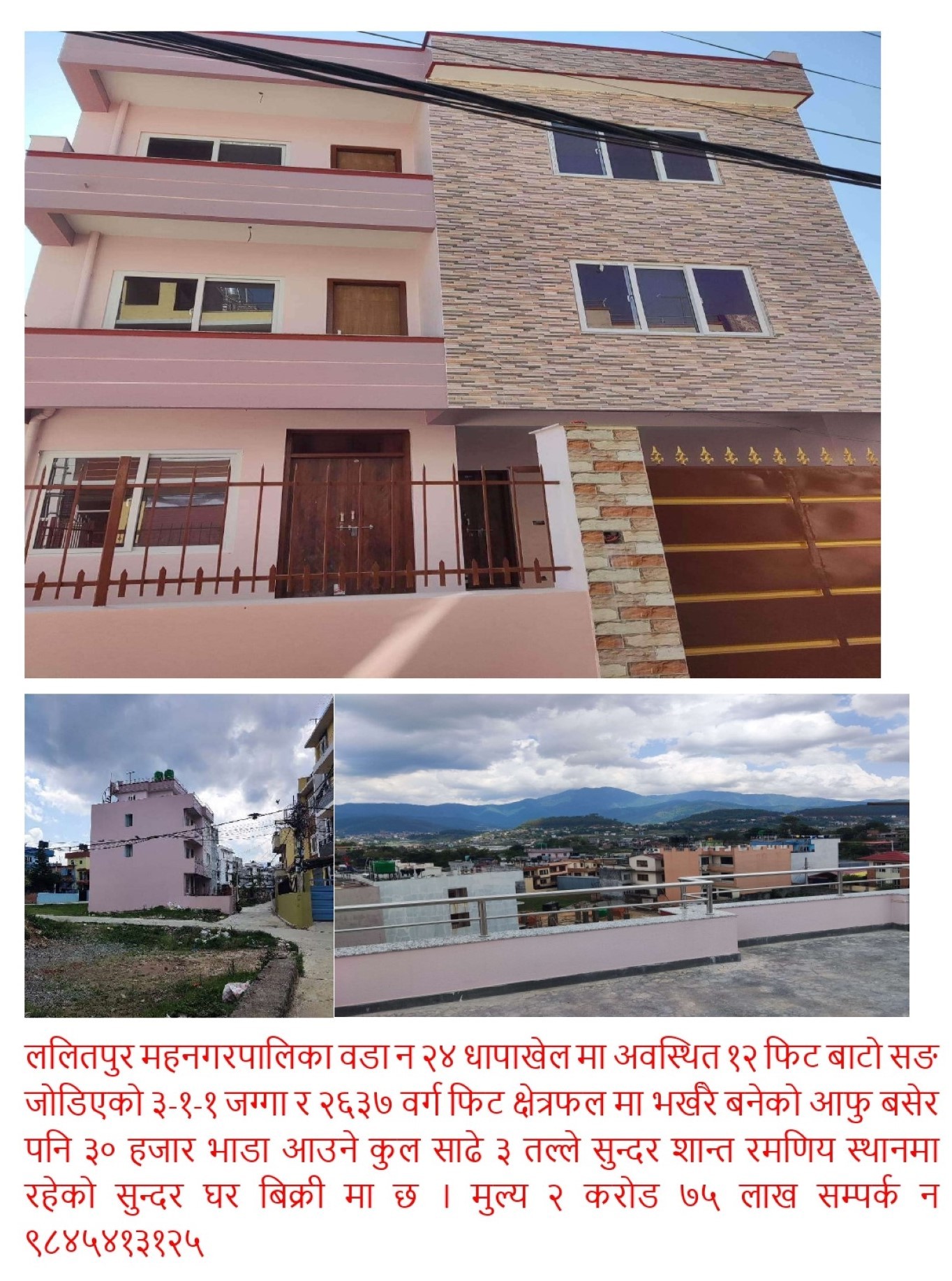ललितपुर महनगरपालिका वडा २४ धापाखेल मा अवस्थित १२ देखी २० फिट बाटो सङ जोडिएको ३-१-१ जग्गा र २६३७ वर्ग फिट क्षेत्रफलमा भर्खरै बनेको आफु बसेर पनि ३० हजार भाडा आउने कुल साढे ३ तल्ले सुन्दर शान्त रमणिय अग्लो सम्म (पानी नजमने) स्थानमा रहेको सुन्दर घर बिक्रीमा छ ।