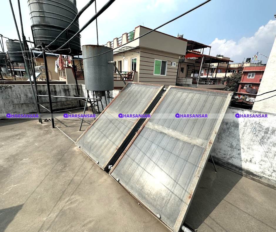 Open terrace with water storage tank.